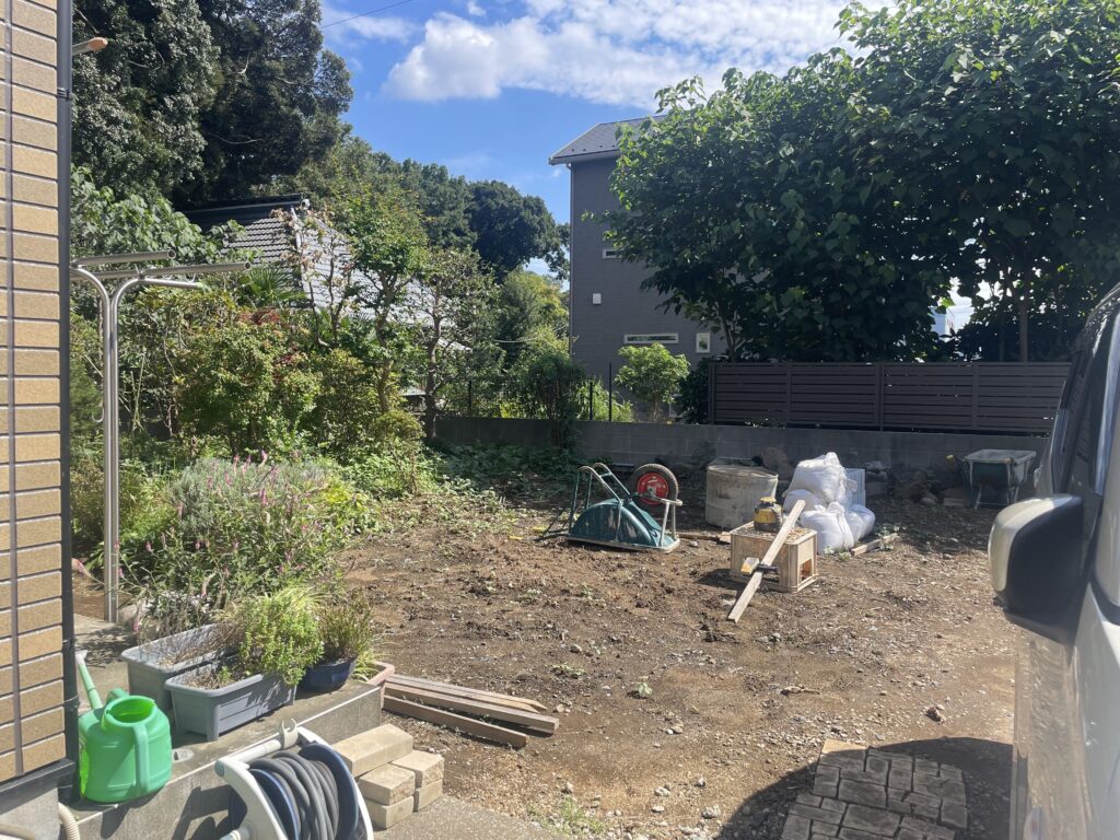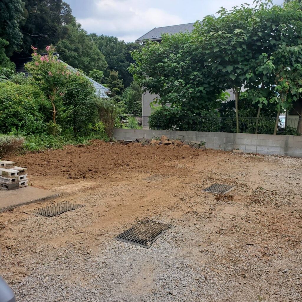 お庭全体が雑草に覆われ、さらに地面には多くの石が埋まっていました。まずは整地作業を行い、お庭の基盤を整えました。