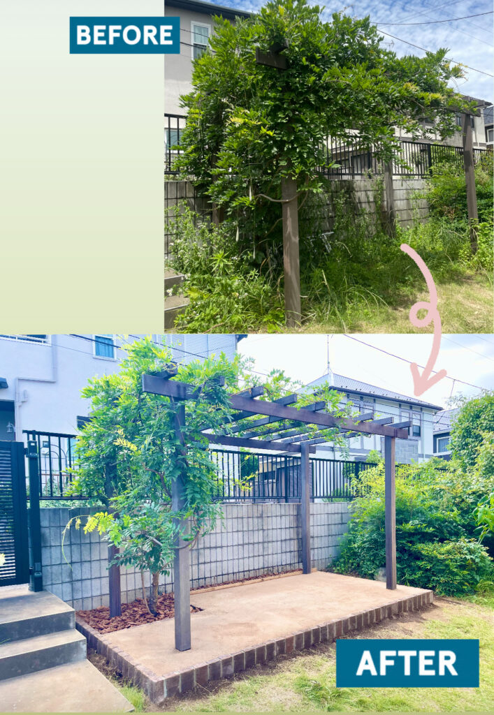 お庭に立派に育った藤棚がありましたが、足元は雑草が生え、ゆったりと過ごすには少し使いづらい状態でした。「藤の木をもっと活かしたスペースにしたい」とのご要望をいただき、施工を行いました。